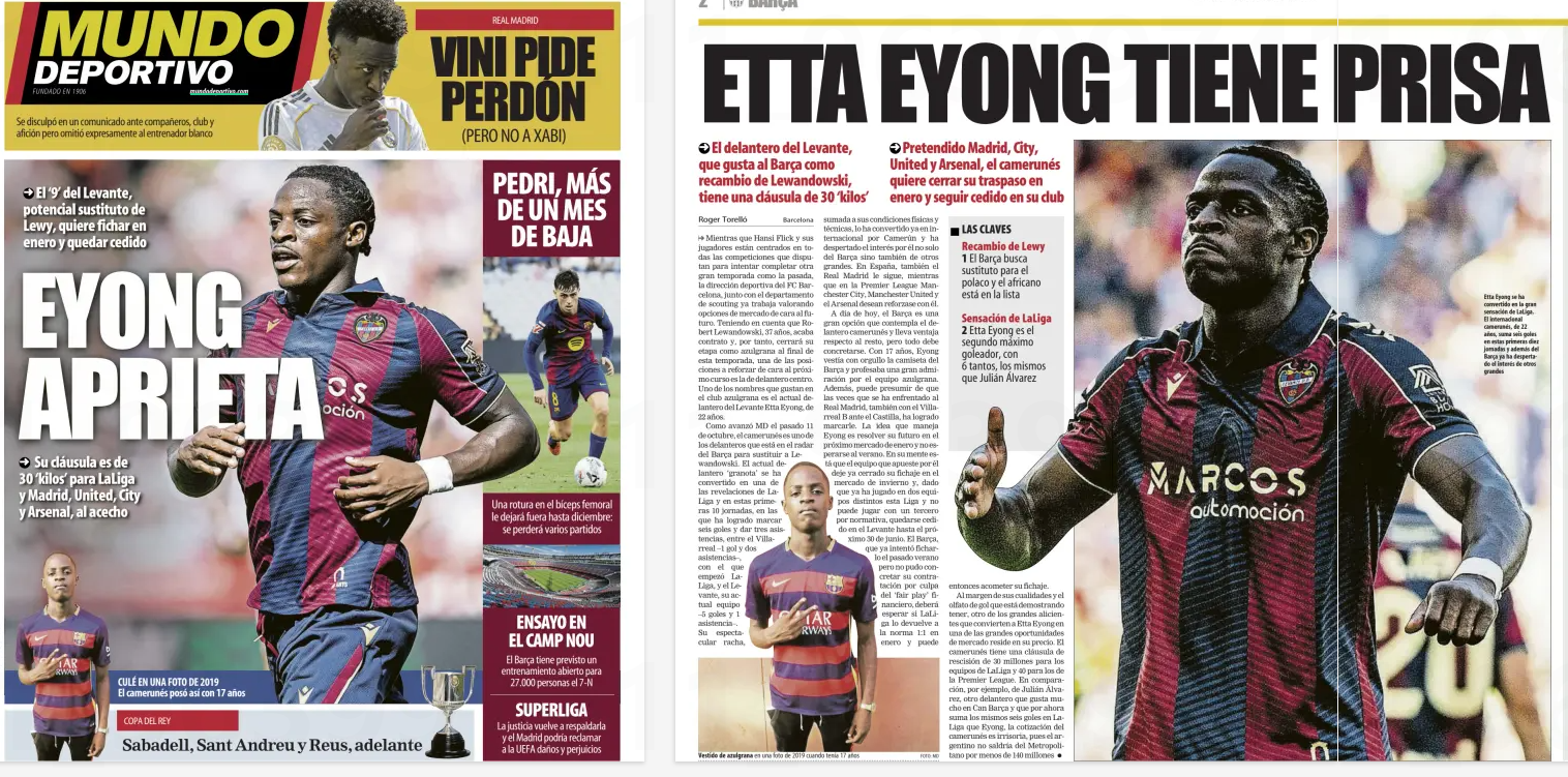 Manchester United, Manchester City, and Arsenal are interested in signing Levante UD’s Karl Etta Eyong, who has impressed with six goals and three assists in 10 matches. Barcelona and Real Madrid are also monitoring him as a potential replacement for Robert Lewandowski. Eyong’s contract includes a €30m clause for La Liga clubs and €40m for Premier League sides. Barca may need to manage their funds to sign him in January, while English clubs may be less likely to invest in a new striker, especially in the upcoming transfer window.