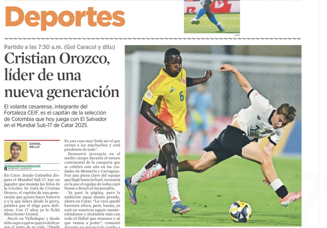 Colombian midfielder Cristian Orozco is being hailed as a future star by El Espectador. Manchester United has signed the 17-year-old for $1m, considering him a ‘bet for the future’. Orozco, described as a leader with excellent ball control, is currently with the U-17 team at the World Cup in Qatar.